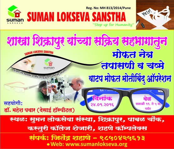Suman Lokseva SansthaShikrapur Branch organized Free Eye Check-up & Motibindu Operation camp on 24th January 2016 at Shikrapur.