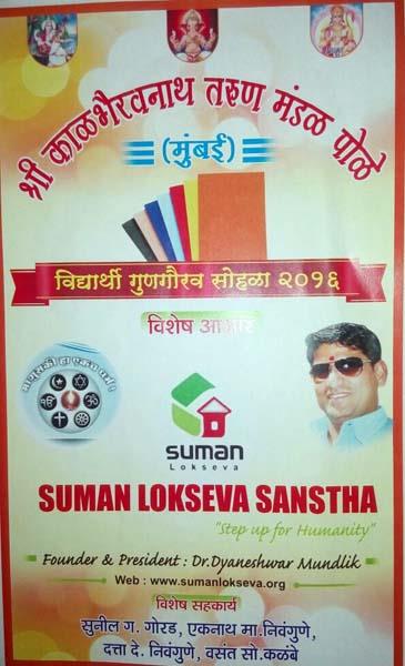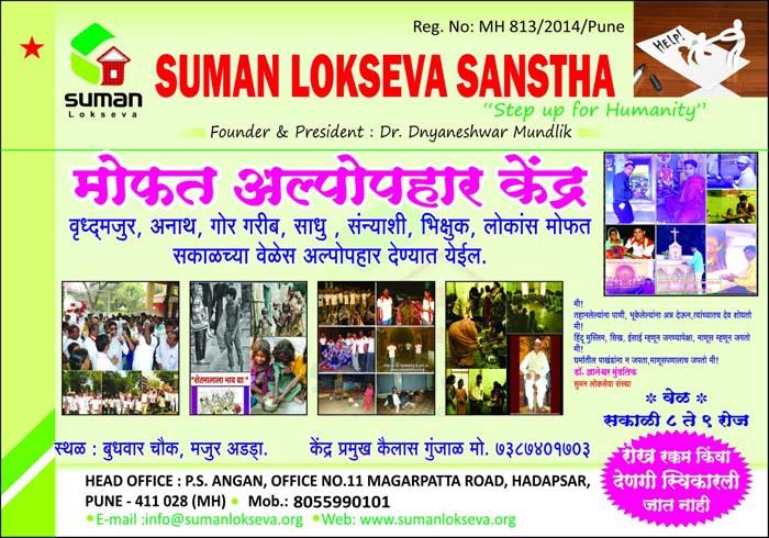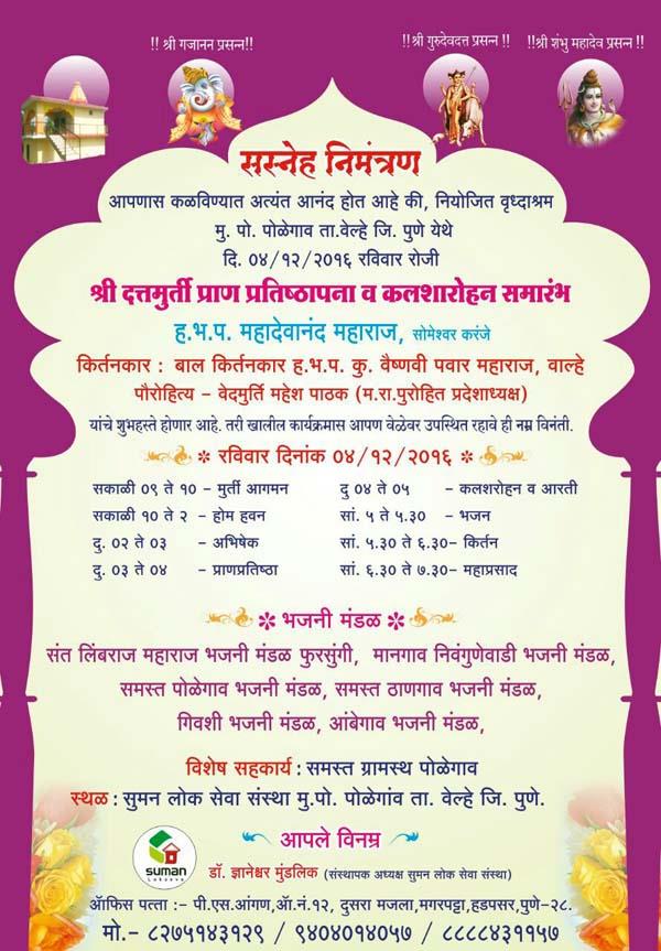 Suman Lokseva Sanstha organised Dattatray Pornima Utsav at Old Age Home at Polegaon, Pune. Date: 12th January 2017. Programme Details : Abhishekh – Morning 7 am to 8 am, Grantha Wachan – Morning 8 am to 9 am, Namsmaran – Morning 9 am, Aarti – 12 am, Mahaprasad – 12.30 to 7 pm.