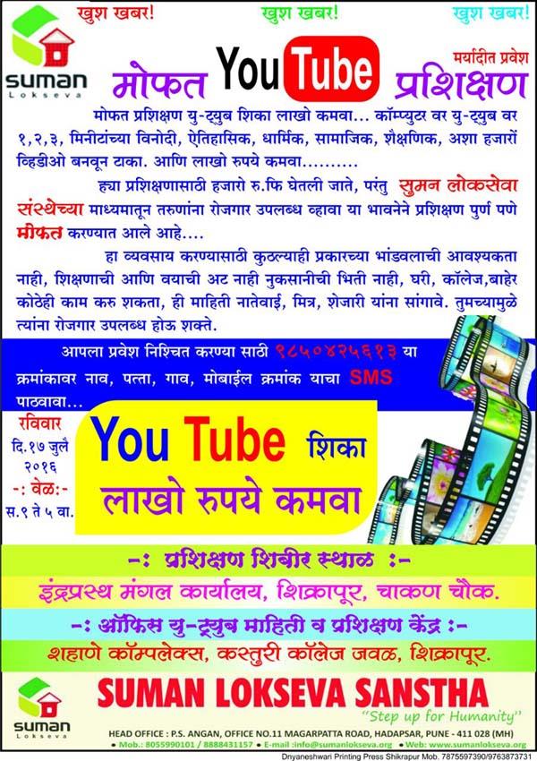 Free YouTube Training to Earn Money on 17th July 2016 at Indraprastha Mangal Karyalay, Chakan Chowk,Shikrapur - Call and Book Your Admission - 9850425613